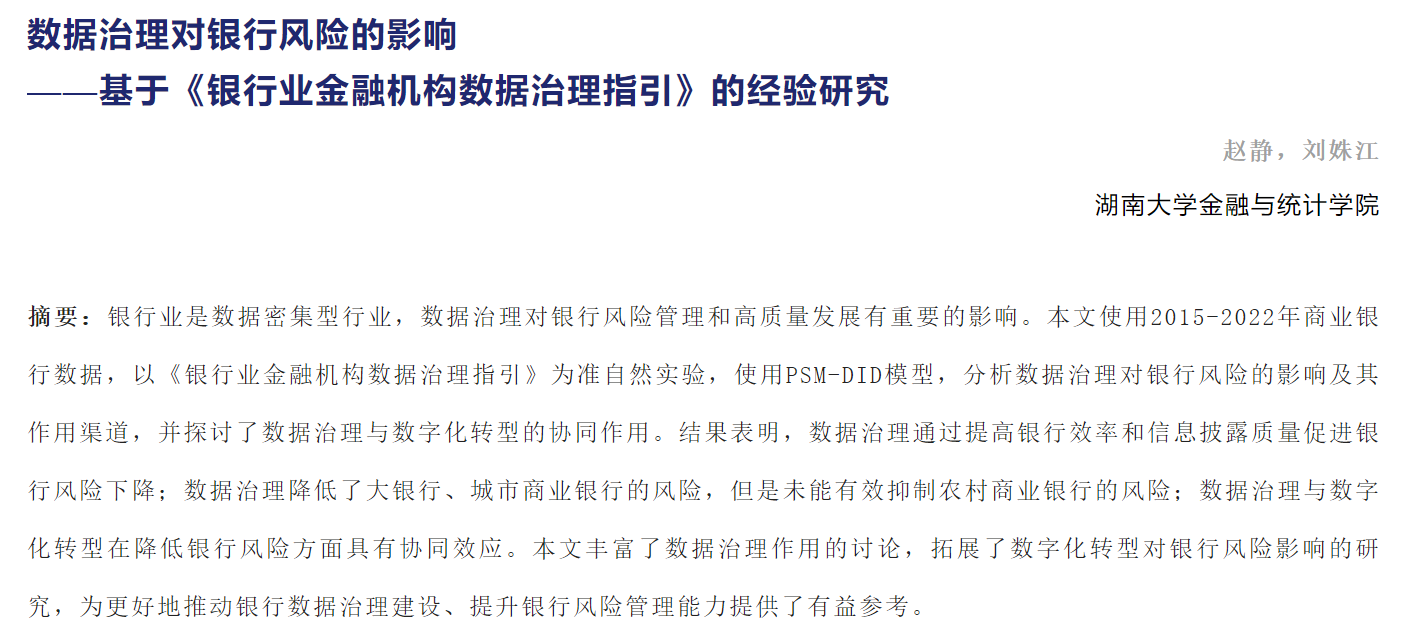 近日,sm调教 应用金融系赵静副教授和2022级硕士研究生刘姝江合作的题为“数据治理对银行风险的影响——基于《银行业金融机构数据治理指引》的经验研究”的论文发表在《金融研究》2025年第2期。