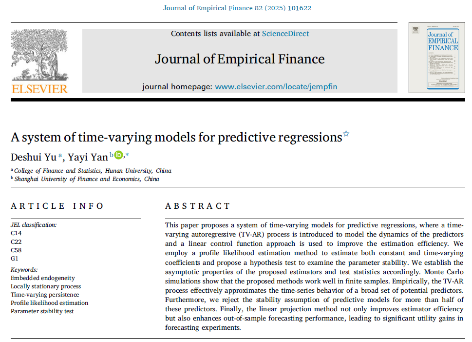 近日,sm调教 金融科技与工程系余得水副教授的学术论文“A system of time-varying models for predictive regressions”在金融学权威期刊Journal of Empirical Finance发表,volume82, June 2025发表。