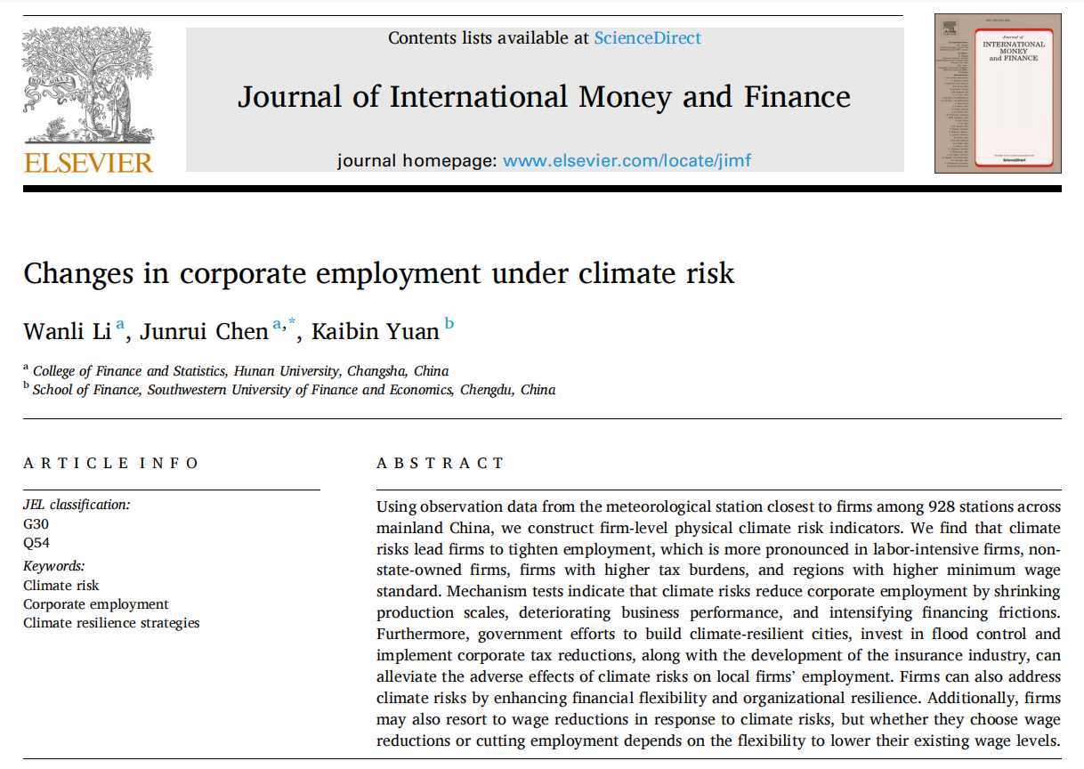 近日,sm调教 应用金融系李万利副教授与2023级博士生陈君睿合作的论文“Changes in corporate employment under climate risk”在国际金融学领域权威期刊Journal of International Money and Finance发表。