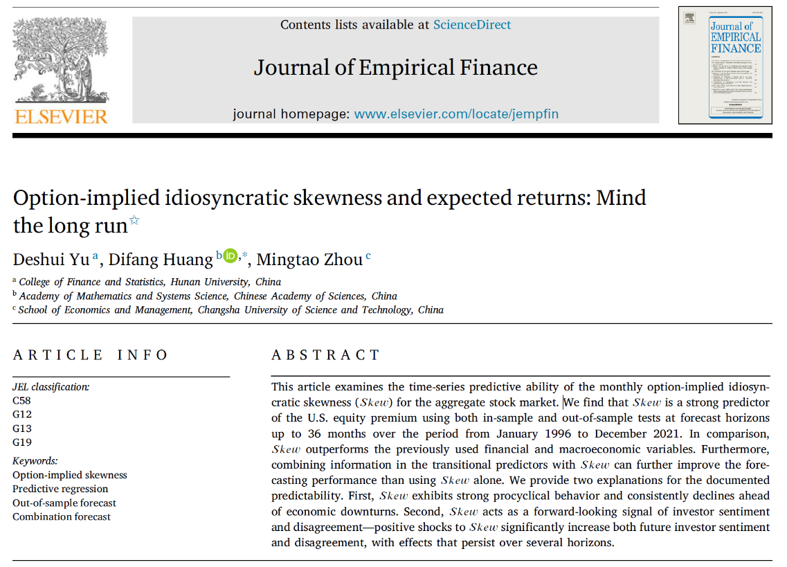 近日,sm调教 金融科技与工程系余得水副教授的论文“Option-implied idiosyncratic skewness and expected returns: Mind the long run”在院定A2类期刊Journal of Empirical Finance,volume 83,September2025发表。