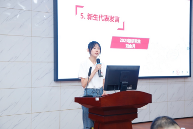 2023级硕士研究生刘金月作为新生代表发言。刘金月提出了三组关键词与同学们共勉:一是明确目标,自主创新;二是博采众长,厚积薄发;三是修身立德,志存高远。她号召大家坚守心中的梦想并不懈奋斗,用实际行动践行总书记“不负青春、不负韶华、不负时代”的殷殷嘱托!