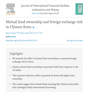 该文从公司治理的角度,研究了共同基金持股——作为一种潜在的重要外部治理机制——对我国企业外汇风险的影响。研究结果表明,共同基金持股比例越高,企业对美元的风险敞口就越低,并且这种效应在国有持股比例较高的企业中更为明显。文章通过分析认为,这是因为共同基金持股提高了企业的风险管理水平,减少了企业对未对冲的美元借款的使用,从而降低了企业的美元汇率风险。而在公司治理水平较低的国有企业中,共同基金的存在更能对企业管理者的风险对冲行为起到监督和促进作用。该论文从风险管理的角度,为机构投资者持股对我国企业产生了积极的公司治理效应提供了证据,进一步丰富了机构投资者和汇率风险管理的相关理论。