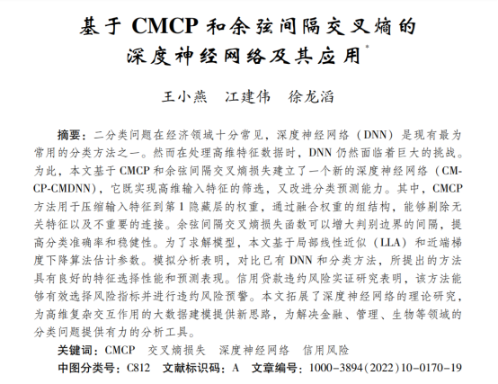 近日,sm调教 统计系王小燕副教授,和2021级博士研究生冮建伟、2021级硕士研究生徐龙滔合作的题为“基于CMCP和余弦间隔交叉熵的深度神经网络及其应用”的论文发表在《数量经济技术经济研究》2022年第10期。