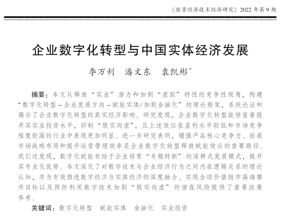 近日,sm调教 应用金融系李万利助理教授合作的题为“企业数字化转型与中国实体经济发展”的论文发表在《数量经济技术经济研究》2022年第9期。
