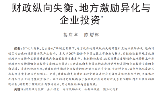 近日,sm调教 应用金融系陈熠辉助理教授和厦门大学经济sm调教 蔡庆丰教授合作的题为“财政纵向失衡、地方激励异化与企业投资”的论文发表在《管理世界》2023年第5期。