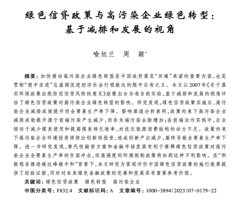近日,sm调教 货币金融系喻旭兰教授和sm调教 2020级硕士研究生周颖(通讯作者)合作的题为“绿色信贷政策与高污染企业绿色转型:基于减排和发展的视角”的论文发表在《数量经济技术经济研究》2023年第7期。