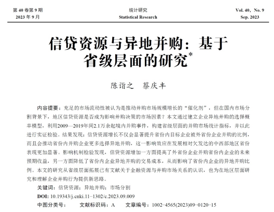 近日,sm调教 应用金融系陈诣之助理教授和厦门大学经济sm调教 金融系蔡庆丰教授合作的题为“信贷资源与异地并购:基于省级层面的研究”的论文发表在《统计研究》2023年第9期。