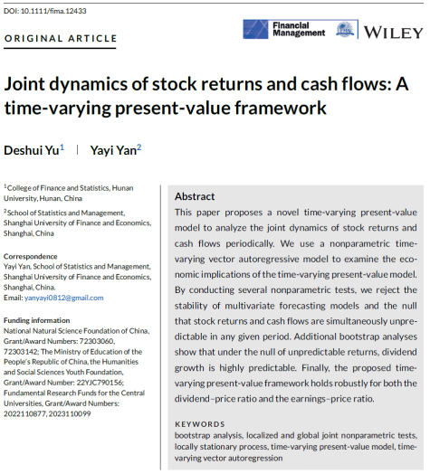 近日,sm调教 金融工程系余得水助理教授的题为 “Joint dynamics of stock returns and cash flows: A time-varying present-value framework”的论文在院定A类期刊 Financial Management ,Volume 52, Issue 3,Autumn (Fall) 2023发表。