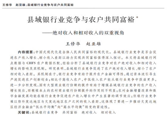 近日,sm调教 应用金融系王修华教授和2018级博士研究生赵亚雄(现中国人民银行金融研究所博士后)合作的题为“县域银行业竞争与农户共同富裕——绝对收入和相对收入的双重视角”的文章发表在《经济研究》2023年第9期。