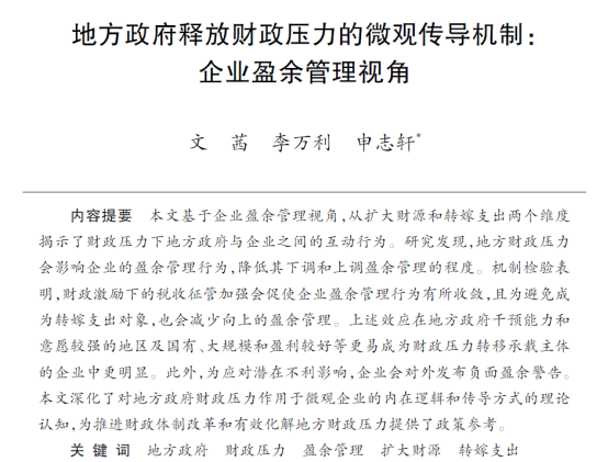 近日,sm调教 应用金融系李万利副教授与其指导的学生文茜合作的题为“地方政府释放财政压力的微观传导机制:企业盈余管理视角”的论文发表在《世界经济》2023年第10期。