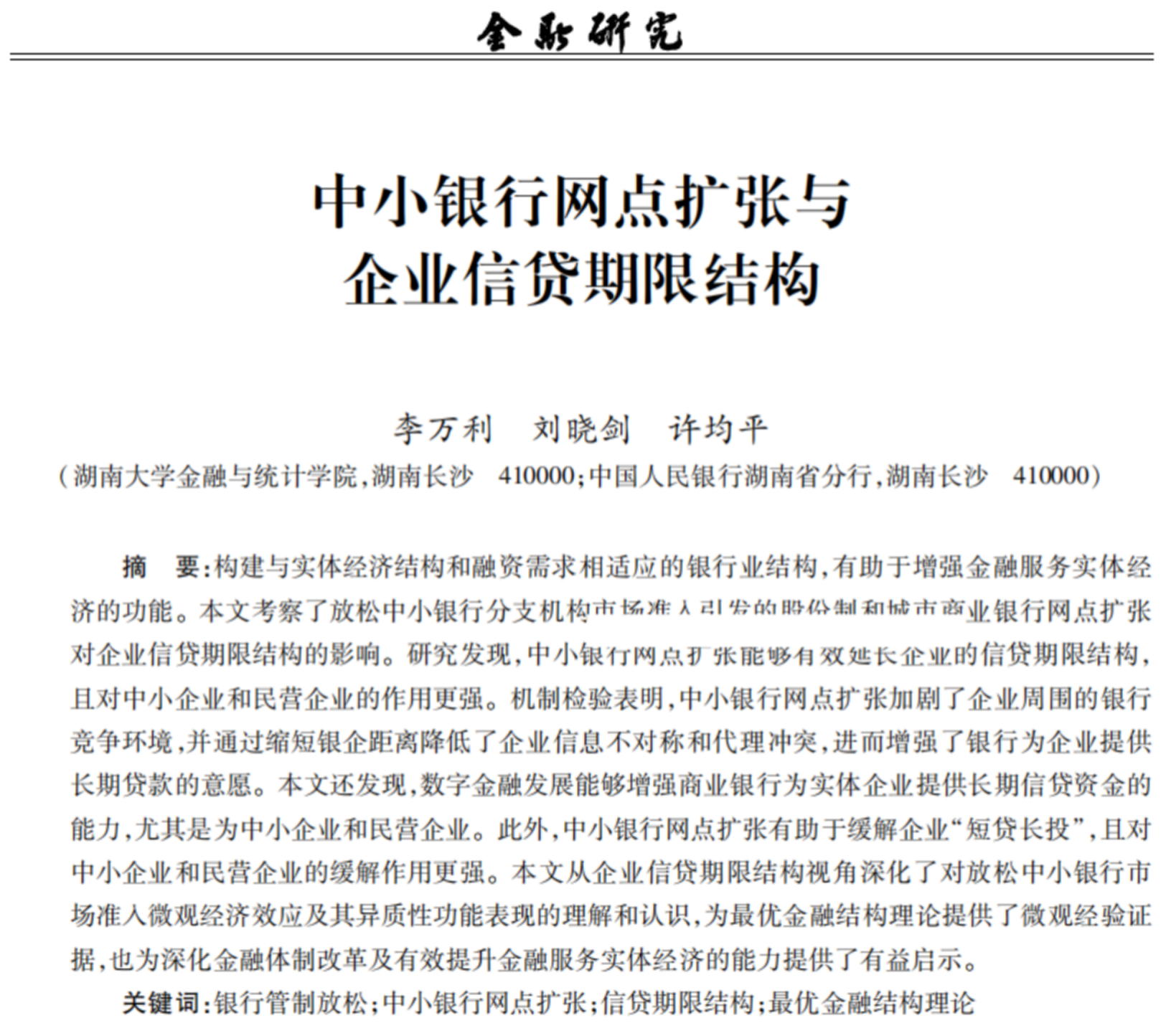 近日,sm调教 应用金融系李万利副教授和货币金融系刘晓剑副教授合作的题为“中小银行网点扩张与企业信贷期限结构”的论文发表在《金融研究》2024年第6期。