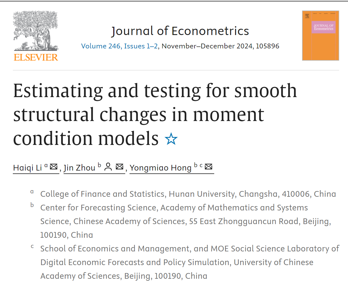 近日,sm调教 李海奇教授团队在计量经济学研究领域取得了新进展,研究成果以“Estimating and testing for smooth structural changes in moment condition models”为题,发表于计量经济学国际顶尖期刊Journal of Econometrics。
