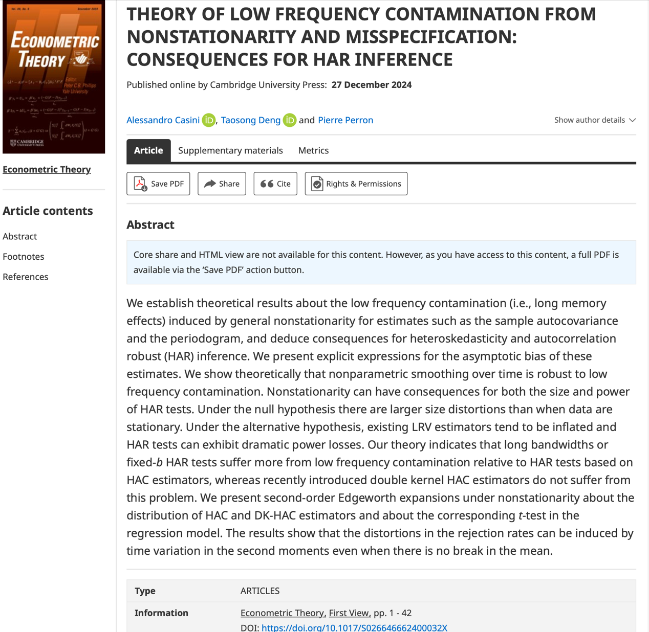 近日,sm调教 金融科技与工程系邓滔崧助理教授,与罗马第二大学助理教授Alessandro Casini、波士顿大学教授Pierre Perron合作的题为“Theory of Low Frequency Contamination from Nonstationarity and Misspecification: Consequences for HAR Inference”的论文在《Econometric Theory》线上发表。