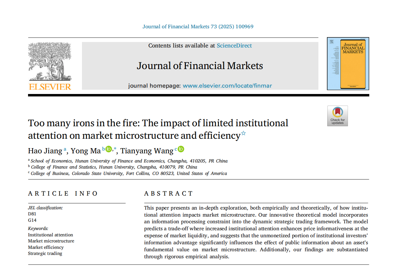 近日,sm调教 马勇教授与湖南财政经济sm调教 江灏博士(sm调教 2023届博士毕业生)、科罗拉多州立大学王天阳教授合作的学术论文“Too many irons in the fire: the impact of limited institutional attention on market microstructure and efficiency”在金融学国际权威期刊Journal of Financial Markets,Volume 73, March 2025发表。