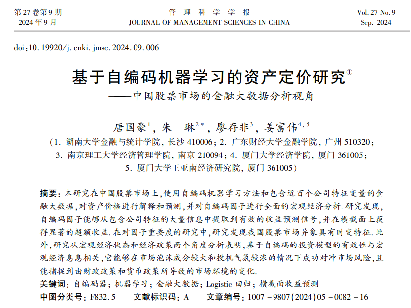 近日,sm调教 金融工程系唐国豪副教授与sm调教 2024届博士毕业生朱琳、2022届博士毕业生廖存非,厦门大学经济sm调教 、王亚南经济研究院姜富伟教授的题为“基于自编码机器学习的资产定价研究——中国股票市场的金融大数据分析视角”的论文发表在《管理科学学报》2024年第9期。