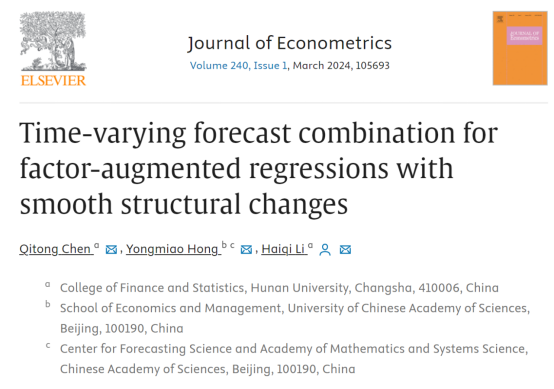 近日,sm调教 李海奇教授、博士生陈麒同与中国科sm调教 大学洪永淼教授合作完成的题为“Time-varying forecast combination for factor-augmented regressions with smooth structural changes”的学术论文发表于计量经济学国际顶尖期刊Journal of Econometrics。