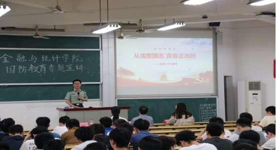 戴部长提到国防离我们并不遥远,从专业上说,我们金统院的同学们都是学习经济金融的,国防经济学也是一门重要的课程,国防开支作为财政支出的一个方面,那么如何把这些国防经费用到刀刃上呢?这就需要懂经济的你们来出谋划策,同时,我们部队中也需要很多懂经济的人才呀,死读书要不得,湖大的传统--经世致用可不能忘。从个人角度上说,我们同学都是成年人,都需要进行兵役登记,这是我们每个公民的义务。我们可以选择参军入伍投身国防一线,有一句话叫做“当兵后悔两年,不当兵后悔一辈子”,但据我所知,当了兵的还真没有后悔的,因为军队是一个大家庭,一个大熔炉,可以有效的锻炼大家的各种能力,参军入伍是一个自我锻炼的过程,也是一段重要的人生经历,部队生活可以强健我们的体魄,培养我们的品格,坚强我们的意志,帮助我们看到更大的世界,看到更大的集体,看到更大的自己。同时,在谋职谋生等众多方面,参军入伍都会对个人今后的学习工作生活有着极大的帮助。我们学校的参军入伍政策也特别好,可以解除大家的后顾之忧,为我们同学的参军之行提供方方面面的帮助。