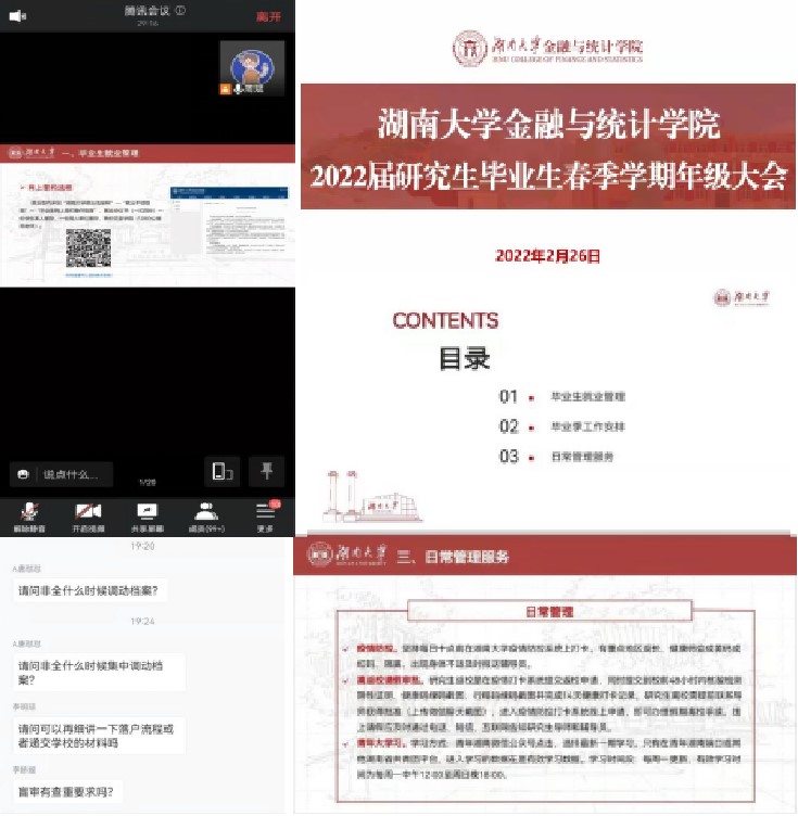 周斌聚焦于毕业生工作及日常管理工作两大重点,就毕业生就业管理、毕业季工作安排、日常管理等方面进行阐述。从就业推荐表领取、网上签约流程、网上违约办理、取消毕业计划、就业报到证办理、各类材料审核盖章、就业材料报送等方面,在会上详细理顺了毕业生就业管理的系列流程,并对毕业生遇到的问题进行集中答疑解惑。针对毕业季的工作安排,他讲解了学位论文答辩、优秀毕业生推选、毕业生体检、档案转寄、离校手续办理等大家集中关注的问题。此外,他就日常管理工作对毕业生年级进行了着重强调,提醒大家注意疫情防控、严格执行离校返校审批制度、准时完成“青年大学习”网上主题团课的学习。