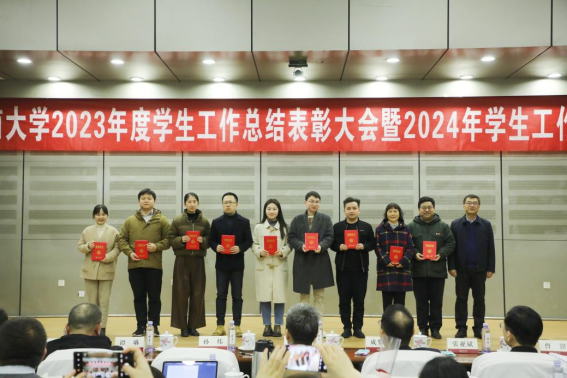 周斌(左五)、王雪雯(左六)作为学生工作先进个人上台领奖。