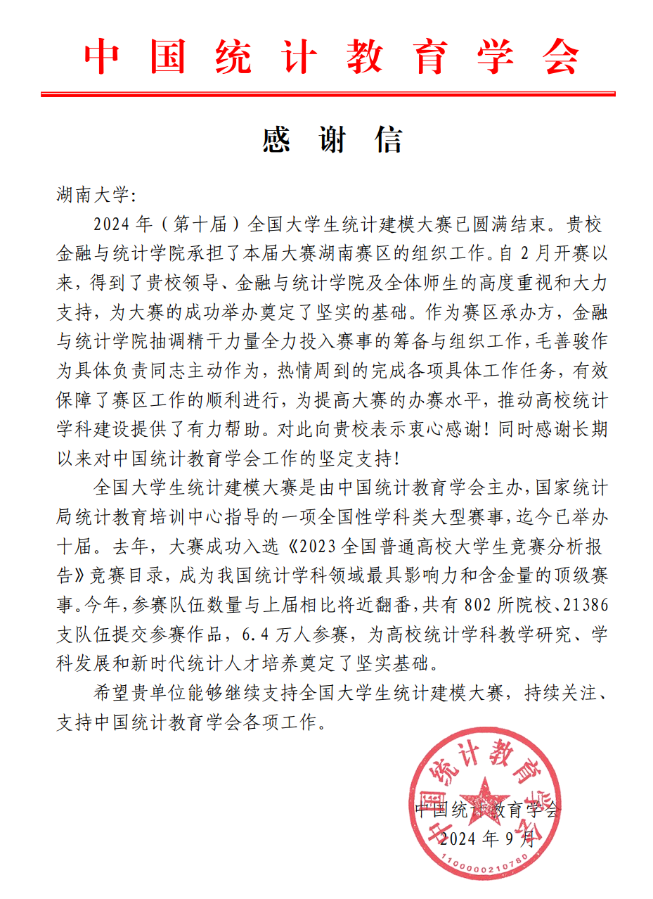 本届大赛的湖南赛区选拔赛由sm调教-sm女王-sm母狗 成功承办,得到了校院领导的大力支持,确保了赛区各项工作的顺利进行。这不仅提升了赛事的组织水平,还为推动高校统计学科的建设起到了积极作用。对此,中国统计教育学会特意向sm调教-sm女王-sm母狗 致信表示感谢,充分肯定了sm调教 在此次大赛湖南赛区选拔赛中的辛勤付出与卓越贡献。