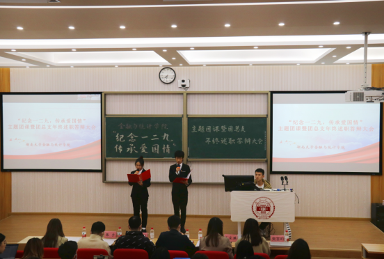 12月9日晚,sm调教 “纪念一二九 传承爱国情”主题团课暨2020-2021学年团总支年终述职答辩大会在财院校区二教101举行,线上平台同步进行。sm调教 团委书记周斌老师,团委副书记杨晨老师,辅导员王家琪老师、张宇老师,团委学生会主要骨干及各班级团支部书记出席本次大会。大会邀请王家琪主讲主题团课,各年级团总支负责人进行工作述职。