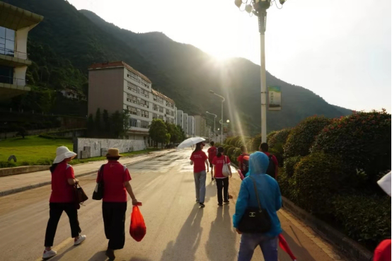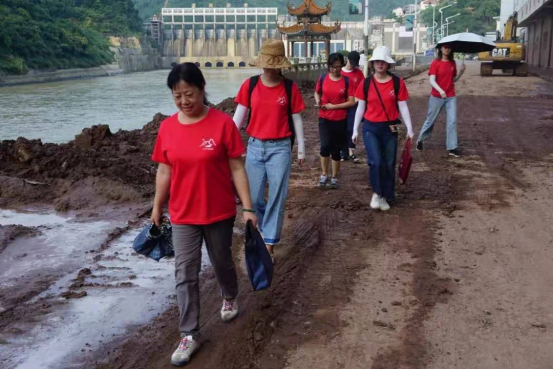 由于车辆禁行,我们最终决定徒步前往渡口登船。徒步沿线,每隔一段路程便可以看见手着扫帚清扫淤泥、用铁锹挖出排水渠、用水枪清刷路面、开动挖掘机铲除石块和厚土的相关人员。调研团成员们不断被沿路灾情所震撼,同时也受到了村民自救精神的鼓舞,对于扶贫攻坚的热情也愈来愈高涨。