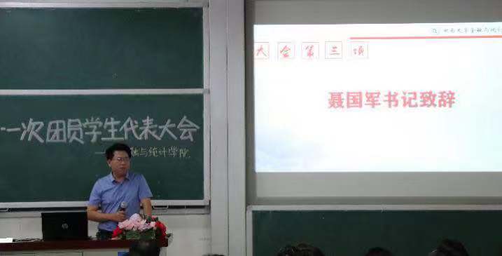 主持人李承业同学在宣读会议须知后,介绍了与会嘉宾,庄严的国歌随之响起,大会正式拉开序幕。大会伊始,聂国军书记率先致辞,他代表党委感谢第十届团委学生会全体同学的辛勤付出,预祝第十一次团员学生代表大会顺利召开,并对金统团学未来的发展提出几点希望:一、要服务好团员青年,做团员青年成长成才的贴心人。二、要引领好团员青年,做团员青年本领高强的示范者。三、要担当好党的助手和后备军,做团员青年政治坚定的先行者。聂书记的讲话振奋人心,现场掌声阵阵。