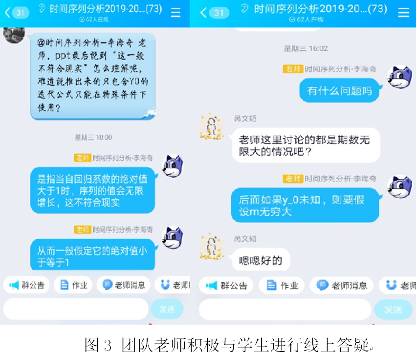 此外,为了让学生尽快适应和熟悉线上教学平台,时间序列分析课程组老师积极与学生进行沟通,指导学生安装线上教学软件,了解学生的困难与需求,做到“让每一位学生都能参加课程,不让任何一位学生掉队”。
