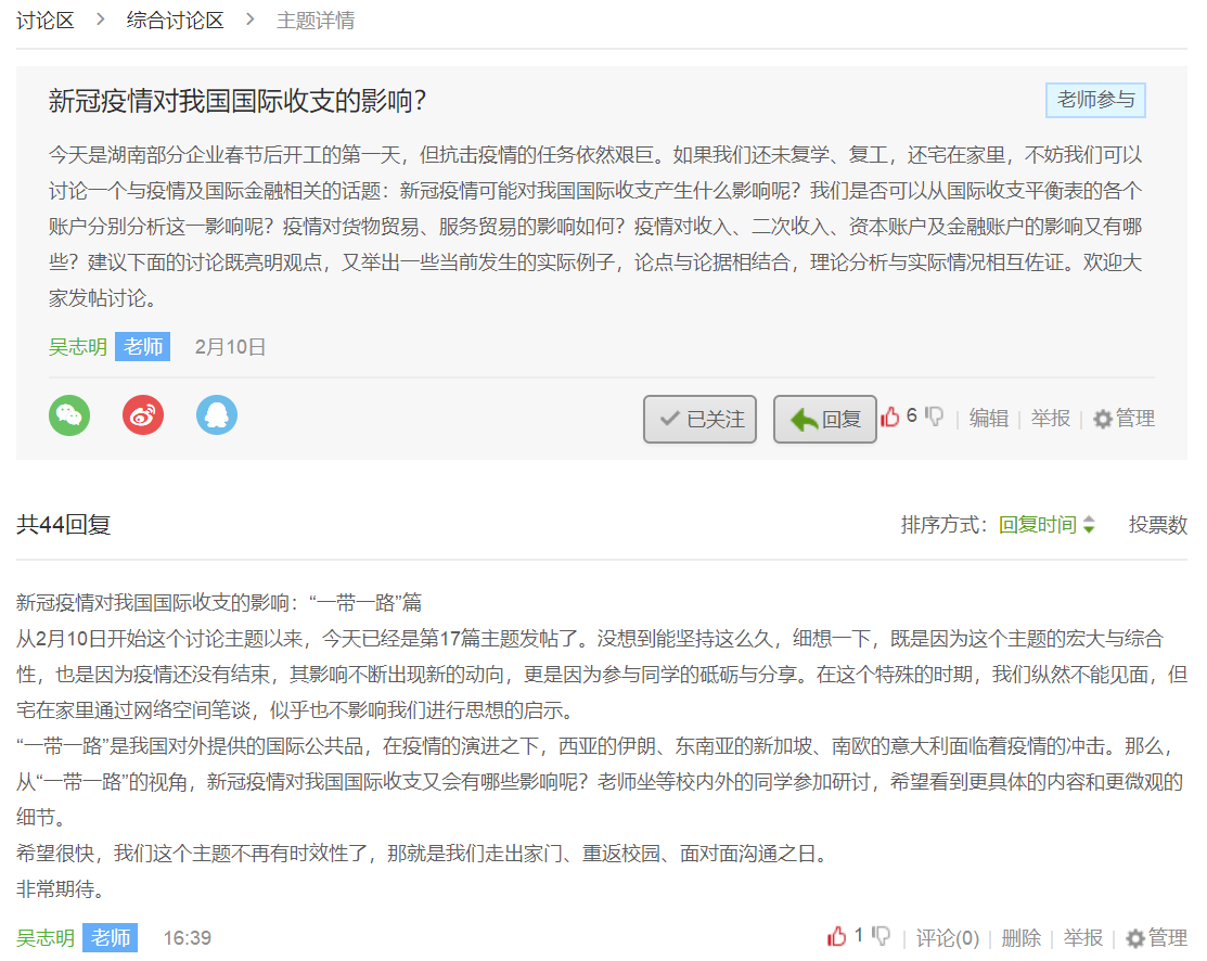 2月10日线上课程开课以来,吴志明老师结合当前热点,在慕课讨论区开启“新冠疫情对我国国际收支影响”的主题讨论。自己坚持每天一帖,已发帖17篇,引导、带动学生回帖40余篇。刘晓剑老师发起人民币汇率问题的主题讨论,何娟文、刘晓兰、杨晓临、马威等老师积极在线答疑,答疑440多次。