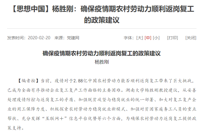 2月20日,杨胜刚教授撰写的《确保疫情期农村劳动力顺利返岗复工的政策建议》一文再次在党建网发表。他深刻分析农村劳动力返岗复工问题,他认为,通过关键时刻的共克时艰,就一定能够取得疫情防控阻击战与脱贫攻坚决胜战的全面胜利。