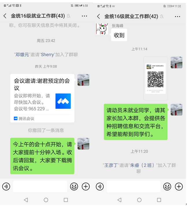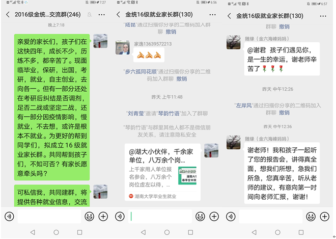 第二,发挥家长的作用,用亲情调动大家。年级建立“金统16级就业家长群”,搭建学校与家庭沟通的桥梁,实现家校联合,为家长了解学校助力毕业生就业的相关政策和平台提供渠道;调动家长的资源,为学生了解就业信息和增加升学机会提供动力。目前年级已有128位家长主动入群,家长与sm调教 建立了密切的联系,信息畅通,在家长的鼓励与帮助下,很多同学重拾信心,找到方向,投递简历,效果显著。后续,sm调教 将继续调动家庭这个大后方,动员家长的力量,为同学们的就业提供保障。