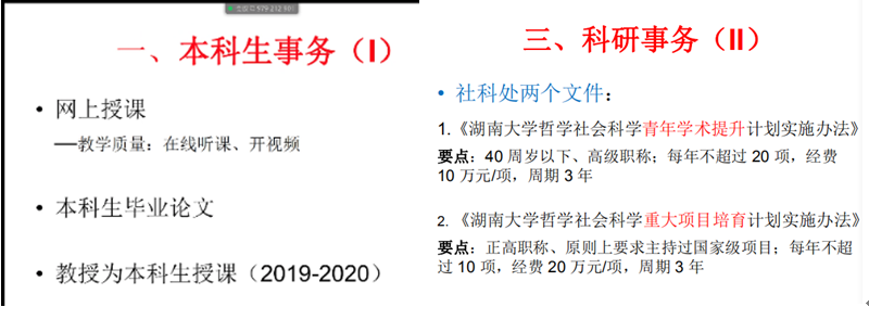 会议第三阶段,应用金融系主任马勇老师首先传达了sm调教 党政联席扩大会议关于教学、科研、学生工作的安排部暑,同时结合应用金融系的实际情况和特点,对本科、研究生疫情期间的学生安全、网上教学、长期发展等进行了细致周到地总结。其次,结合教育部关于科研工作的最新文件,对系里的科研目标和定位进行了梳理,并制定了系本年度的工作目标。最后,结合应用金融系的现有学科优势和学科特点,提出系学科发展方向和人才引进方面的思考。各位老师踊跃参与讨论,纷纷为应用金融系的发展献计献策。潘敏院长指出,要真正结合学校、sm调教 发展情况,制定具有前瞻性、可行性的发展规划,明晰学科发展方向,统筹引进人才。王修华副院长强调要提高团队意识,打造科研团队,营造良好的科研氛围,同时要注意打磨高水平专著,提高学科影响力。晏艳阳教授指出这次会议对系里教学、科研等方面有了更清晰的定位,强调了人才布局和团队建设的重要性。戴晓凤教授强调学科发展方向的凝练要兼顾应用系的特色。其他老师对疫情防控、系发展规划等多方面工作各抒己见,提出了很多很好的宝贵建议。