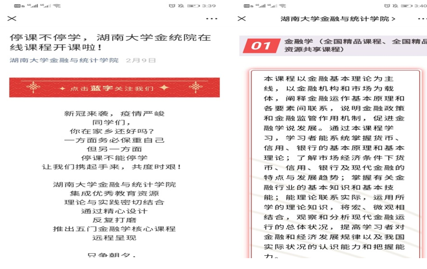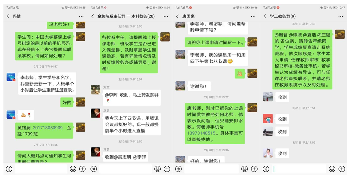 2月17日开课以来,教务办李晖老师,会同校优秀教学秘书、校宣传工作先进个人吴璇玺老师一起,及时联系任课老师,了解在线教学的开展情况。及时总结一周在线教学运行状况;及时提醒授课教师充分做好在线教学多种预案;及时传达学校有关本科教学工作的会议精神。在抗击“疫”情活动中,涌现出一批积极投入教学战“疫”的优秀教师,本科教学管理团队先后推出两期:“战‘疫’记:那些在线传道解惑的金统人”新闻报道,并推出课程团队报道多篇,受到各方的一致好评。