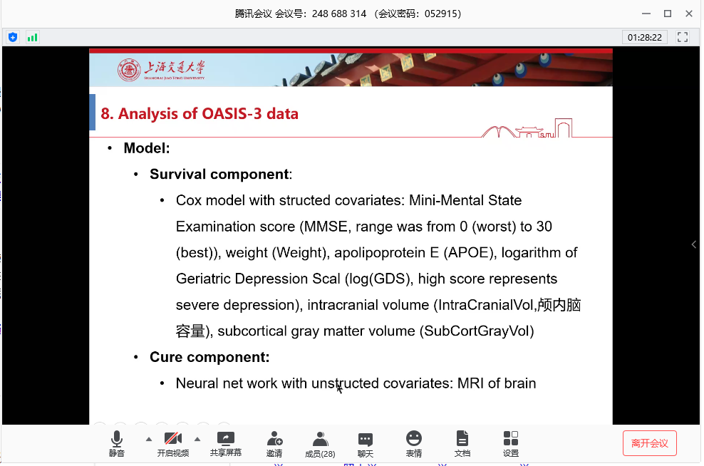 俞章盛教授在讲座中重点介绍了混合治愈率模型和推广时间治愈率模型的估计方法。根据他多年的统计理论研究和临床应用研究发现:包含潜在治愈受试者的生存数据在临床研究中很常见,对这类数据通常采用混合治愈率模型来进行分析。而非固化概率通常由非参数、高维甚至非结构化(例如图像)变量来预测,这对传统的非参数方法,如样条和局部核估计是一个挑战。对于混合治愈率模型和推广时间治愈率模型,他提出了将神经网络结合起来的算法,在治愈率模型中对非参数或非结构化变量的影响进行建模,并利用期望-最大化(EM)算法来估计参数,得到了估计量的渐近收敛速度。仿真研究表明,该方法在预测和估计方面都具有良好的性能。最后,他分析了原发性胆道肝硬化(PBC)数据和开放访问系列成像研究(OASIS)数据,以说明所采用方法的实际使用效果。