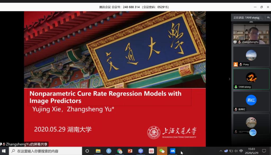 sm调教 疫情期间的“云端学术”气氛浓郁,2020年5月29日第253期金融与统计论坛利用腾讯会议线上举行。本次论坛邀请了上海交通sm调教 物信息及生物统计系俞章盛教授来院进行学术交流,并做题为“含有图像输入的治愈率模型的估计方法”的学术报告。此次论坛由sm调教 统计学系系主任谭发龙副教授主持,sm调教 教师及硕、博士生踊跃参与此次论坛。
