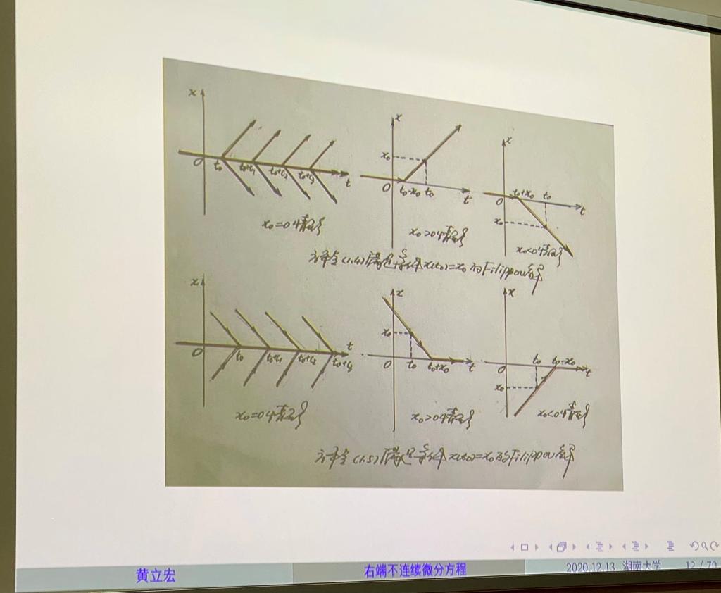 来自长沙理工大学的黄立宏副校长受邀报告了“右端不连续方程在经济、金融与管理中的一些应用简介”,首先深入浅出对右端不连续方程的理论进行了介绍;采用了经济管理中的一些政策的制定和切换,以及如何科学捕鱼等问题来说明右端不连续方程的应用;使得抽象高深的右端不连续方程展示了实际应用的魅力。黄教授在百忙中不仅亲自准备了演讲的PPT,还提前手画了精美的图像,来辅助说明抽象的右端不连续微分方程解的特性,给大家留下深刻印象。点点滴滴的细节中,展示了严谨的学者风范和名师风采。