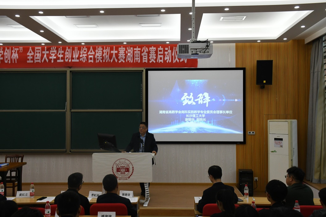 湖南省高教学会商科实践教学专业委员会代表、长沙理工大学谢朝华副院长致辞时表示希望通过本次大赛,为sm调教 双创教育与实践培育新动能,用新动能推动新发展,以新发展创造双创教育与实践的新辉煌。