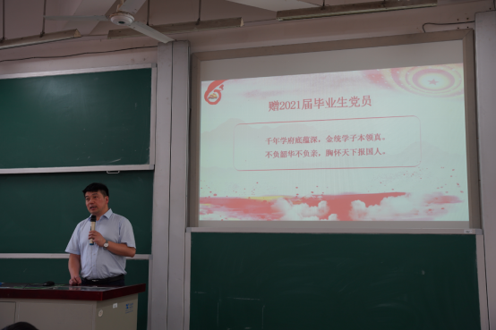 紧接着,他向大家介绍历次党代会上的湖大人,并根据习近平总书记系列讲话内容,鼓励毕业生党员从百年党史和湖大校史的学习中筑牢理想信念,树立远大理想,汲取奋进力量,争做新时代有为青年,为母校争光,为党旗添彩!