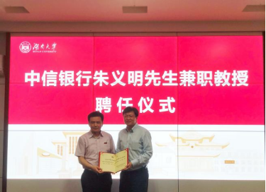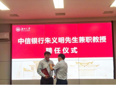 6月24日下午,sm调教 在2号楼226会议室举行中信银行朱义明先生兼职教授聘任仪式。院长潘敏、书记黄红立、副院长吴志明、王修华等出席仪式。仪式由副院长吴志明主持。