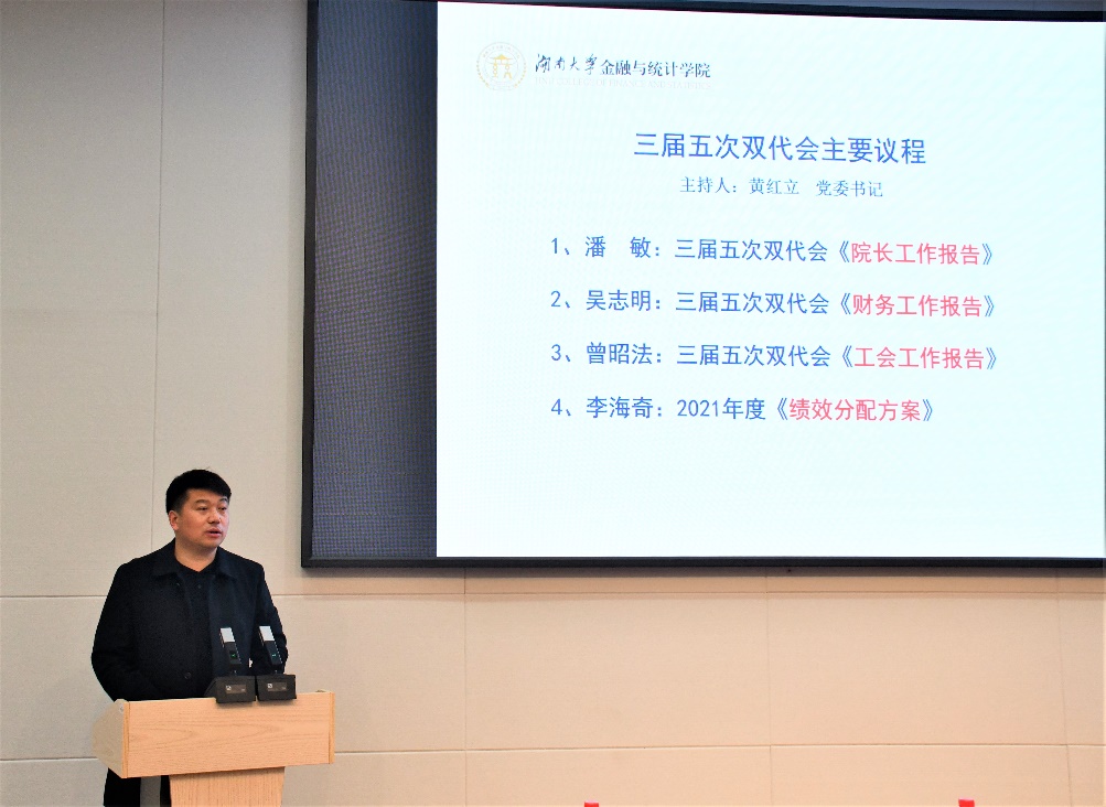 1月15日,sm调教 三届五次双代会在财院校区食堂报告厅顺利召开。sm调教 领导班子、各工会小组代表及110余名教职工出席会议,院党委书记黄红立主持会议。