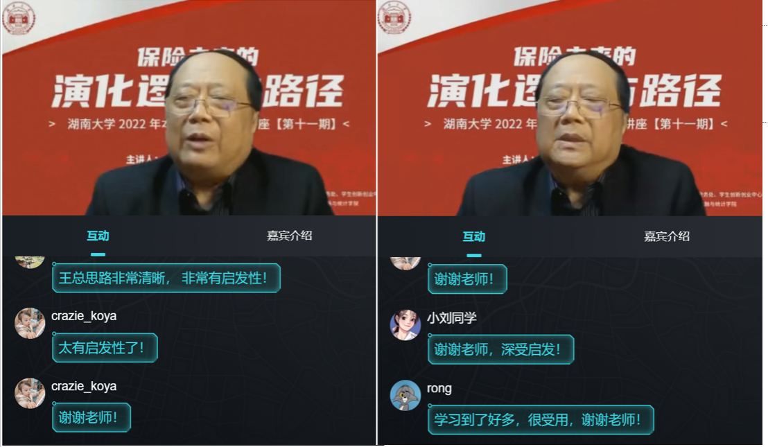 在主题内容分享结束后,主持人张宁教授从直播间互动留言中收集了同学们的问题向王会长提问,王会长就同学们提出的问题进行了深度分析与解答。如:针对人口老龄化,国家出台了一系列政策,包括税收优惠、住房抵押保险、专属商业养老保险,但为什么效果差强人意?保险业如何破解我国养老难题?保险是一种生产关系,科技是一种生产力。请问保险与科技协作与创新的基础是什么?保险科技产生的风险开始呈现,在保险科技发展与应用过程中,如何发扬保险科技的正面效应而避免负面效应?能否防范化解相应的风险。师生们对于王和教授所讲的内容展现出了极大的兴趣,纷纷表示受益匪浅。