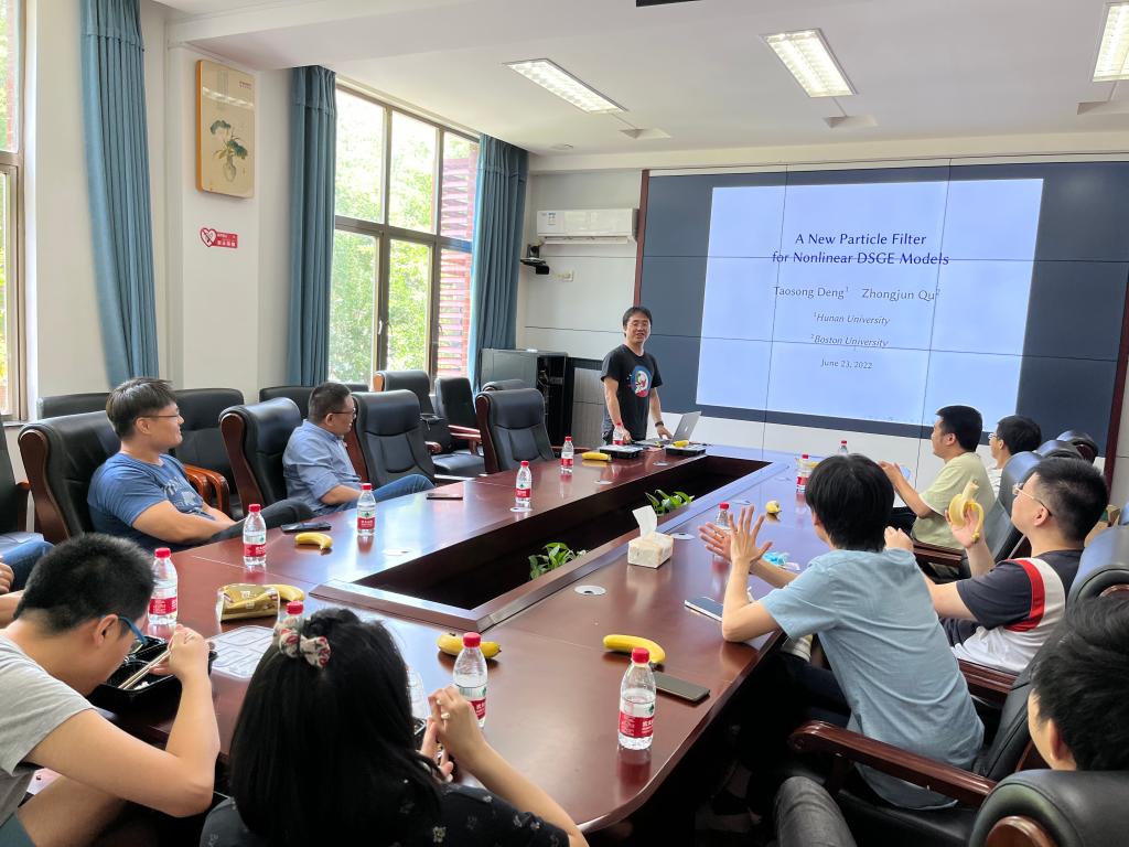 研讨会上,邓滔崧老师作了主题为《A New Particle Fileter for Nonlinear Dynamic Stochastic General Equilibrium Models》的学术报告。学术界与业界对非线性动态随机一般平衡(DSGE) 滤波器模型的需求不断增加。目前,文献内流行的模型之一是粒子滤波器。然而,该滤波器需要在测量方程中添加测量误差才能实现,否则就会出现奇异性导致算法失效。相反的是,测量误差不是DSGE 模型的共同特征。受此限制的启发,邓滔崧老师通过将状态向量映射到两个子向量来开发一种新的粒子滤波器:一个其分量被观察到的子向量和一个其分量是潜在的子向量。该项研究通过仅对潜变量的粒子进行采样和传播,避免了引入测量误差的需要,并建议使用级数展开以潜在变量为条件来近似可观察量的密度。作为一个重要特性,新滤波器还允许使用复合似然来研究奇异DSGE模型,从而提供对奇异和非线性DSGE 模型的统一处理。