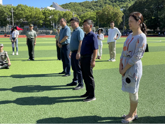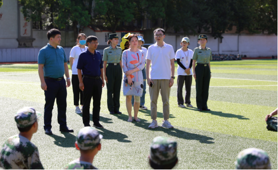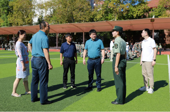 8月26日上午,sm调教 院长王修华,党委书记黄红立,党委副书记颜李在sm调教 学工办主任谢君、新生辅导员周斌的陪同下,来到财院校区操场看望慰问2022级参训新生、承训教官以及新生助理。