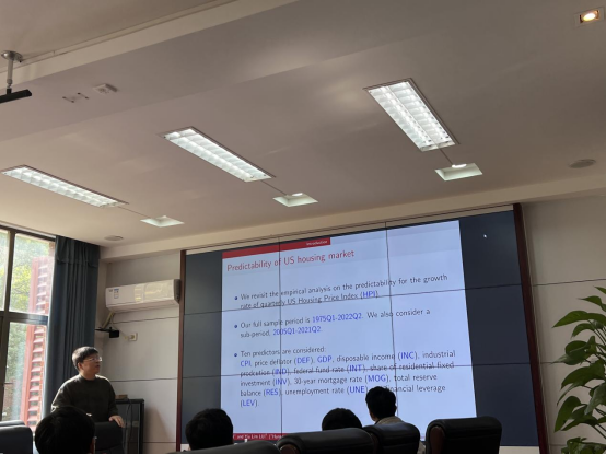 研讨会上,主讲人费毅捷老师做了主题为《Testing Predictability in the Presence of Persistent Errors》的学术报告,针对伪回归提出新方法,并进行实证检验,研究了具有持续误差的预测回归模型下各种统计的渐近行为。研究表明当误差被轻微地或线性地整合时,许多用于预测回归的流行方法将产生发散的检验统计量。基于此提出了一种改进的IVX-AR检验,并证明其在预测因子和误差项的不同持续程度下是一致有效的。模拟研究表明,该检验具有令人满意的有限样本性质。最后,通过实证研究重新讨论了美国房价增长的可预测性,为其提供了一些新的见解。