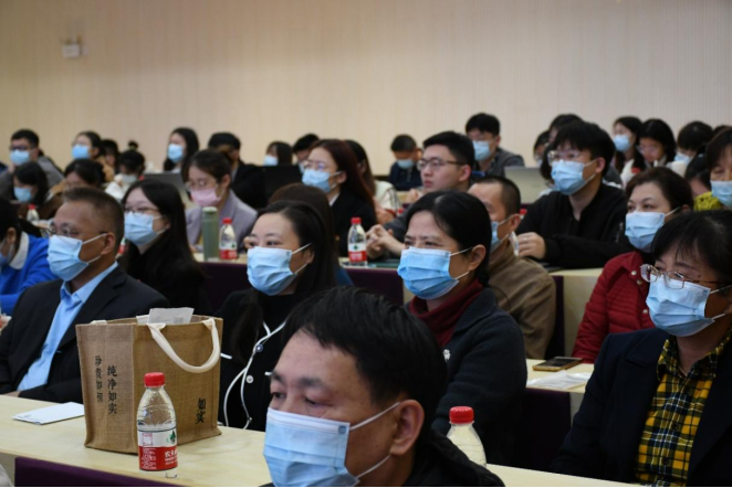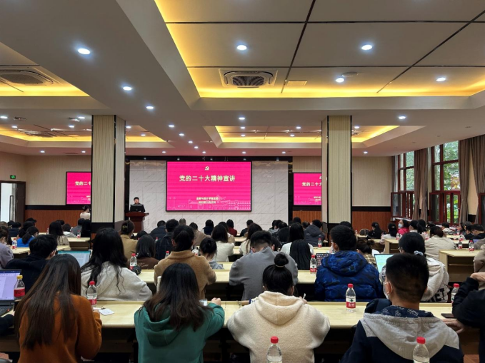 11月22日下午,sm调教 在财院校区大礼堂举行党的二十大精神学习报告会,sm调教 党委书记黄红立领学。sm调教 全体教职工和80余名学生代表一起学习。副院长李海奇主持报告会。