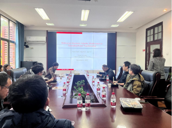 研讨会上,主讲人陈汉老师做了主题为《Multivariate Stochastic Volatility Models based on Generalized Fisher Transformation》的学术报告。针对在构建资产组合、预测股市收益率风险时,方差和协方差的时变性对多变量随机波动率(MSV)建模造成的挑战,提出了一种新的MSV模型构建方法——MSV-GFT模型。陈汉老师从模型设定、模型扩展、模型估计、蒙特卡洛模拟情况以及模型的实证表现五大方面对文章进行了展示。其研究主要贡献包括:对MSV模型进行了扩展,在确保时变的协方差矩阵正定的情况下,使之还可以引入一些时变的因子;考虑方差波动和协方差的非对称效应,将模型扩展到较为一般的情况,便于结果与其他模型进行对比;采用Particle Gibbs Ancestor Sampling方法对模型进行有效估计。同时,从仿真结果和实证结果来看,MSV-GFT模型在特定情况下具有更好的效果。