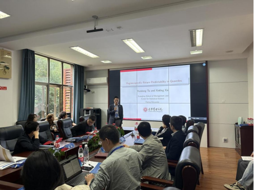 涂云东教授以“Regime-specific Return Predictability in Quantile”为题分享了他的最新研究成果。涂云东教授针对资产回报是否可预测问题,提出了分位数预测回归模型,针对多门限、变量的持续性与混合根情形,提出了对应的算法,并探讨了相关估计量的理论性质。