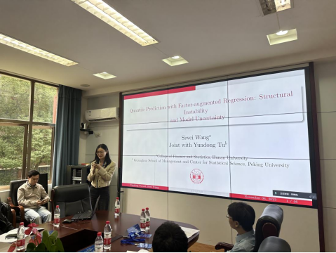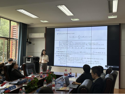 陈亮助理教授带来了题为“Estimation of Characteristic-Based Quantile Factor Models”的报告。陈亮博士首先介绍了因子模型中存在的识别问题,然后提出了一个新的分位数因子模型,将因子载荷设为个体特征的光滑函数,最后,他给出了三步主成分分析方法,探讨了相关的理论性质。