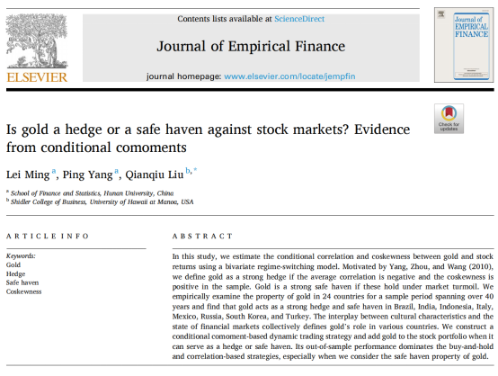 近日,sm调教 货币金融系明雷副教授和2020级博士研究生杨萍、夏威夷大学金融系刘千秋教授合作的题为 “Is gold a hedge or a safe haven against stock markets? Evidence from conditional comoments” 的论文在院定A类期刊 Journal of Empirical Finance, Volume 74, December 2023发表。
