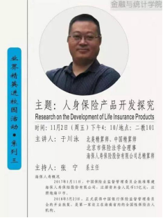 2018年11月2日下午4时,“业界精英进校园活动—系列三:精算师进校园”在我校sm调教 成功举行。出席本次活动的嘉宾有金统院党委书记聂国军,副院长陈迪红、吴志明,风险管理与保险精算研究所所长张琳,保险系主任张宁,保险系硕士生导师邓庆彪。此次活动由保险系主任张宁博士主持,并由我校94级杰出sm调教、海保人寿总精算师—于川泳师兄担任主讲人。